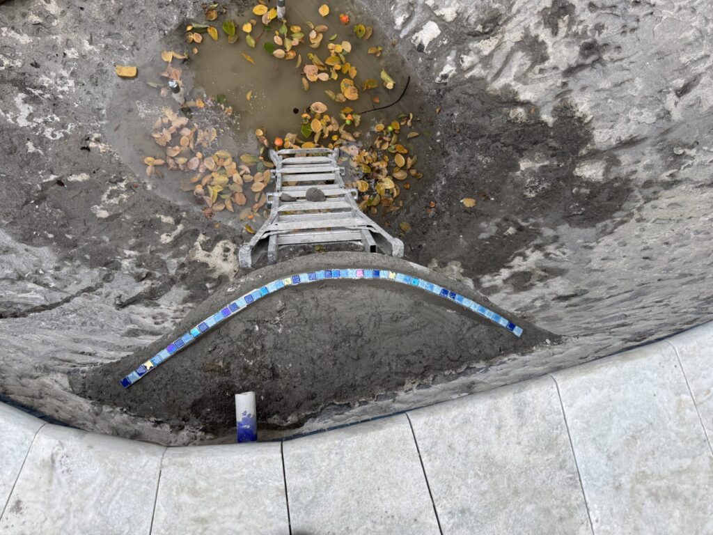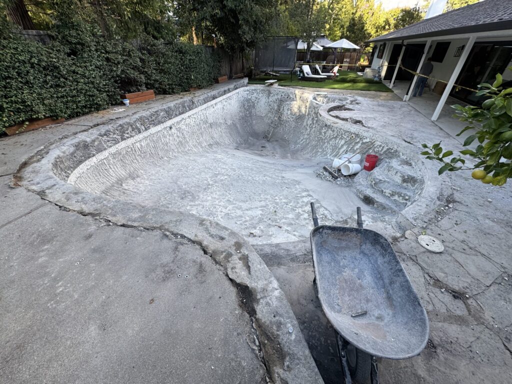 The original pool showed significant wear and outdated materials, including: